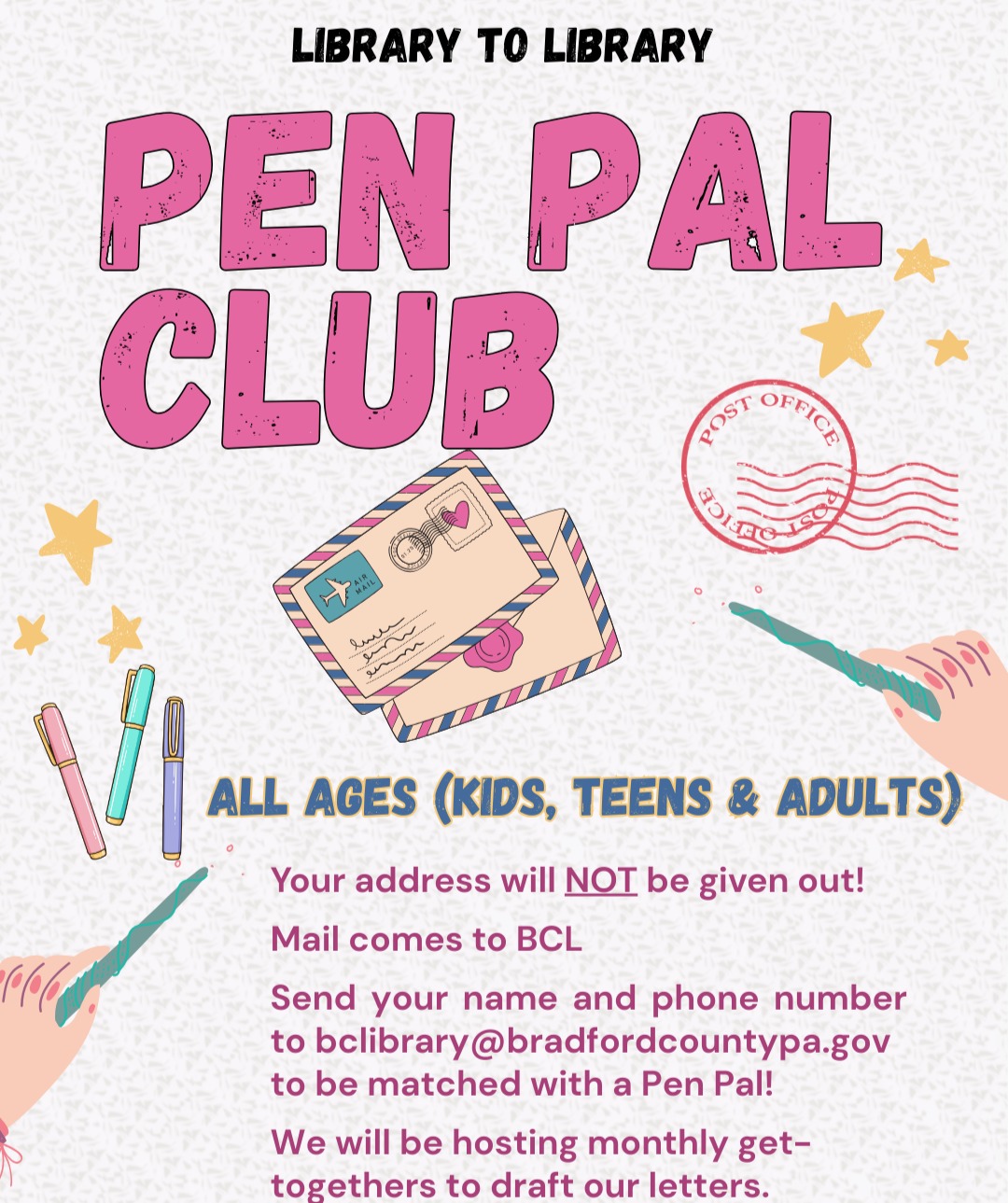 Come to Bradford County Library to join our new Penpal Club! Our first get-together will be on Friday, April 24. Contact us before this date to get registered and matched with someone. On April 24, we will sit together to write letters, work on crafts, and fellowship as we correspond with our out-of-state penpals!